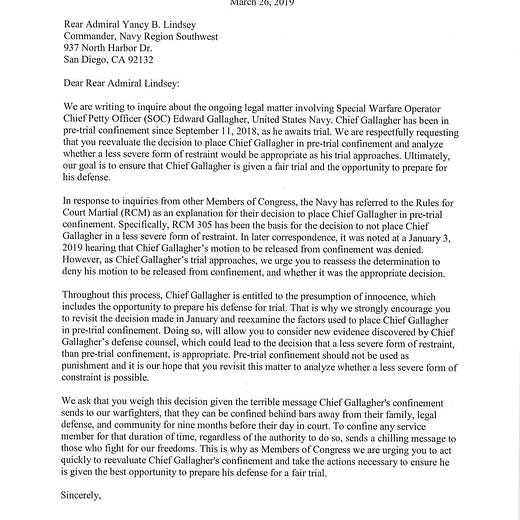 “We ask that you weigh this decision given the terrible message Chief Gallagher’s confinement sends to our war fighters, that they can be confined behind bars away from their family, legal defense, and community for nine months before their day in court,” it adds. “To confine any service member for that duration of time, regardless of the authority to do so, sends a chilling message to those who fight for our freedoms. This is why, as Members of Congress, we are urging you to act quickly to re-evaluate Chief Gallagher’s confinement and take the actions necessary to ensure he is given the best opportunity to prepare his defense for a fair trial.”