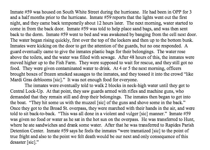 “When the prisoners were finally evacuated from the jail, many were forced to wade through toxic, waste-filled water to the Broad Street overpass on Interstate 10. Prisoners reported that the armed guards at the overpass had K-9 dogs, which were used to threaten them and that they were maced and beaten. Female prisoners also report that deputies directed degrading and sexually offensive comments at them.”