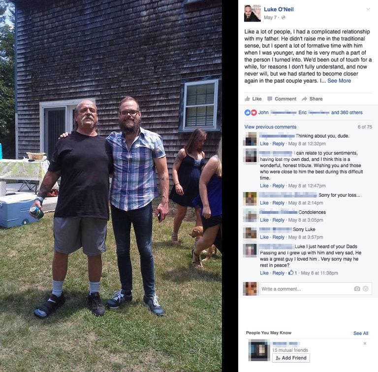 Facebook is an undeniable ill for many reasons, and a boon for countless others, but it's also an extremely efficient tool for the doling out of such sympathy. Without Facebook, a few hundred people would never have known of the passing, or the life, of a man, regardless of how flawed that man was.